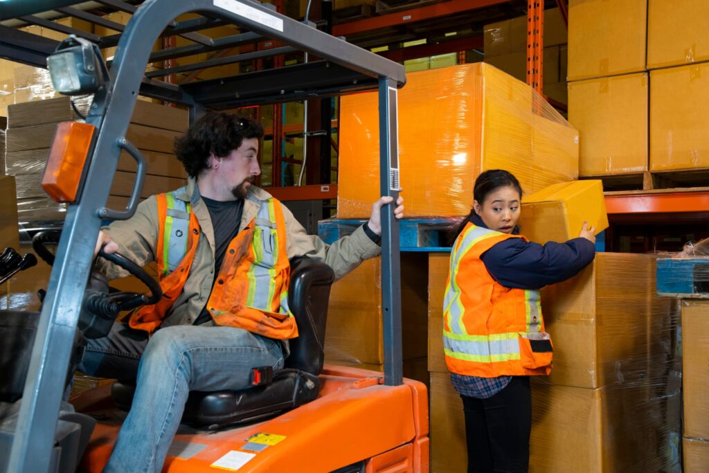 Forklifts and heavy equipment, such as front-end loaders and cranes, pose hazards that can put operators, ground crew, and pedestrians at risk. Plan the safest route out of the area in case heavy equipment gets too close or a load drops unexpectedly. Being aware of your surroundings will prepare you to respond quickly and safely if something goes wrong. No one should be close enough to equipment moving loads to be injured by the load, or to have a load move above their head. There should be barriers in place blocking off the work zone.
